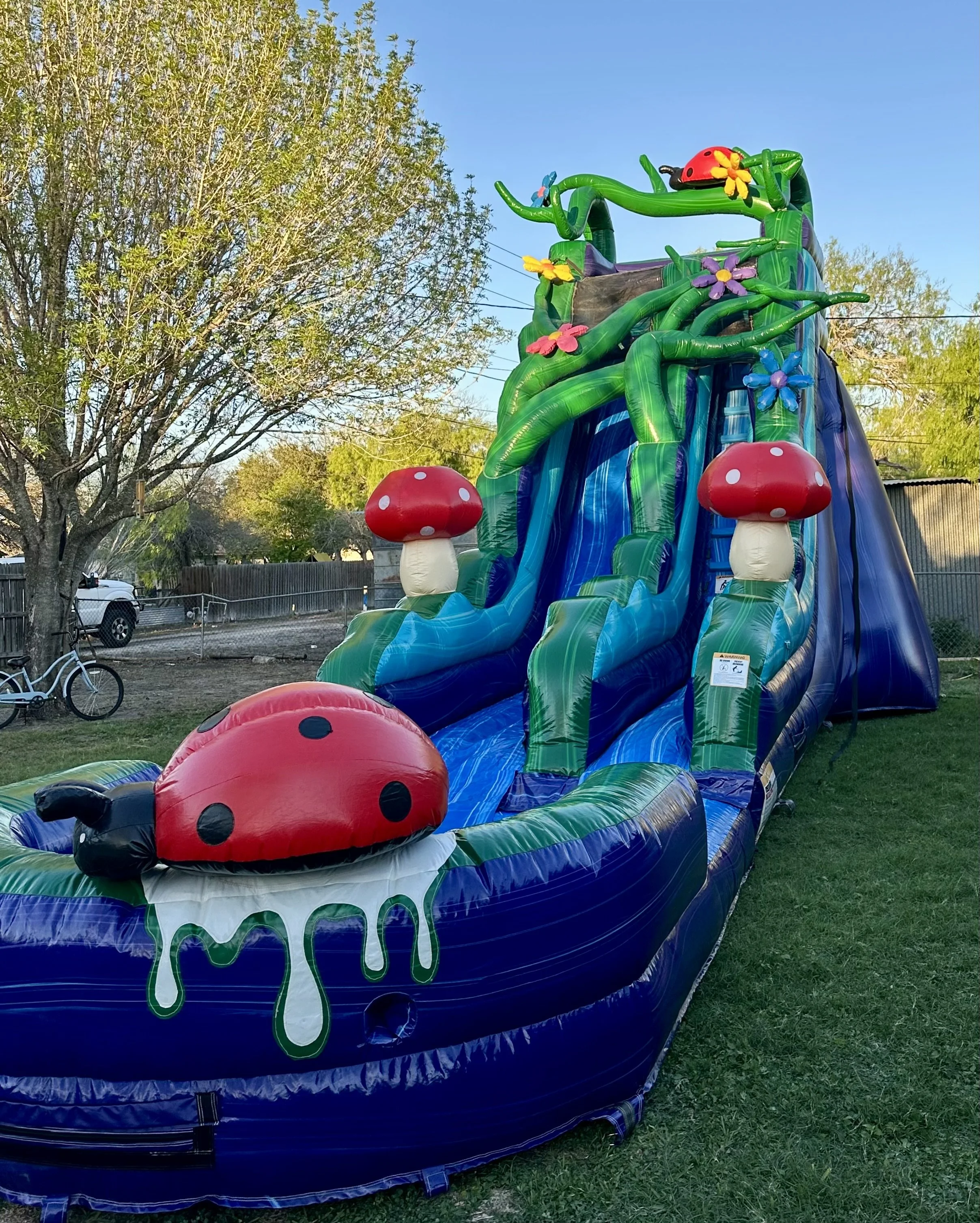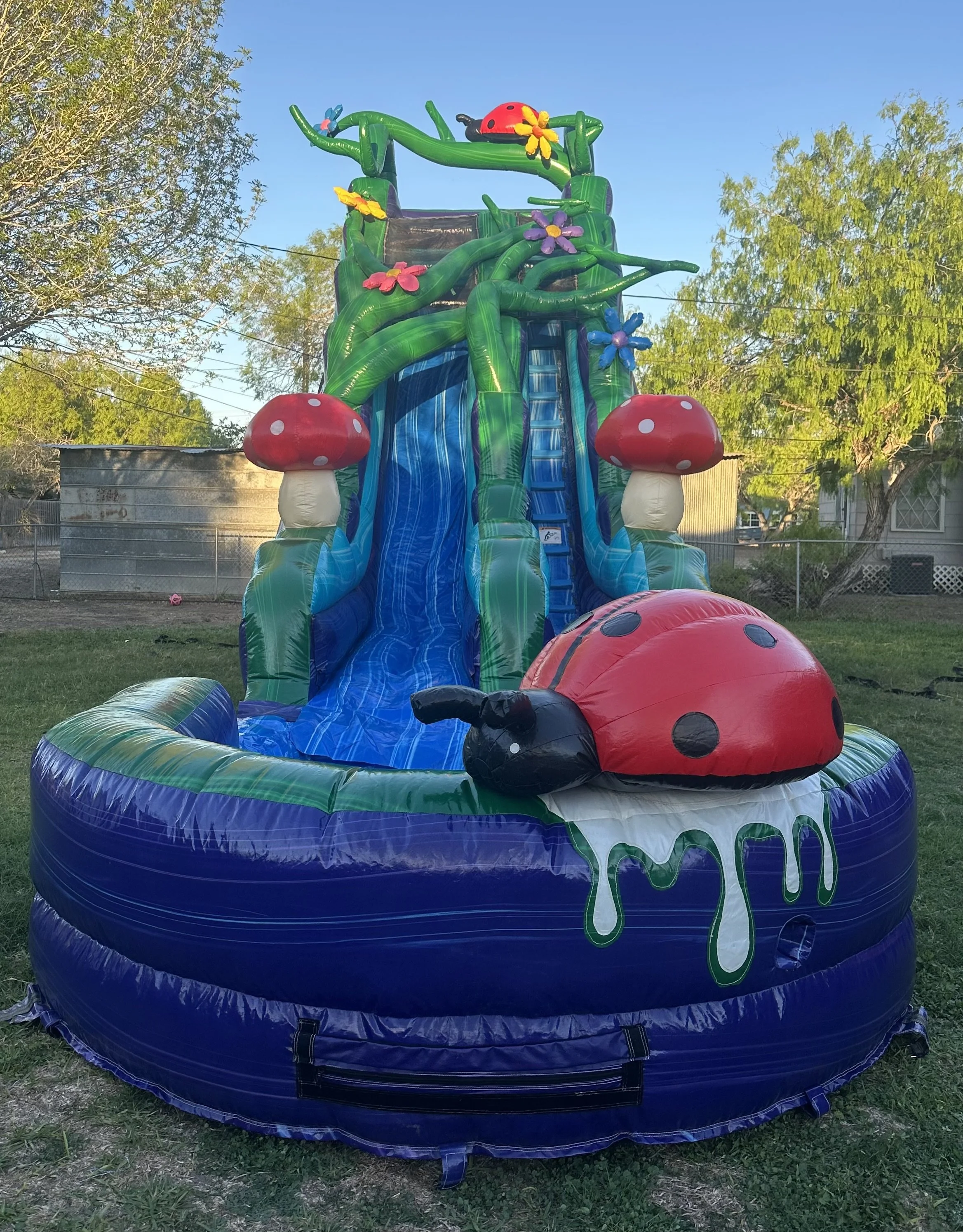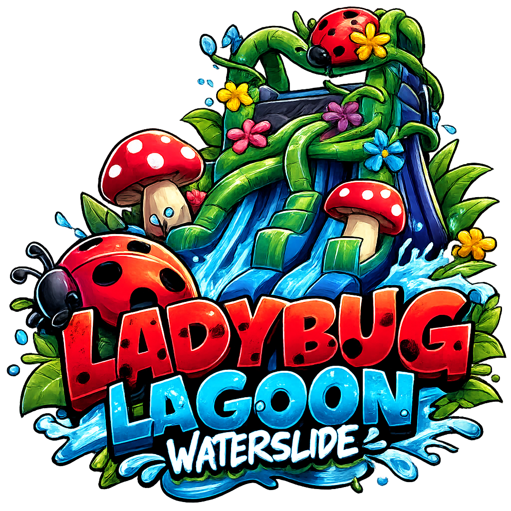 Bring the fun of the jungle to your backyard with the Ladybug Lagoon Waterslide! This bright and colorful 19-foot tall waterslide features giant vines, playful mushrooms, and adorable ladybugs that make every party feel like a tropical adventure. Kids will love climbing to the top and racing down the fast, refreshing slide into the splash pool below!